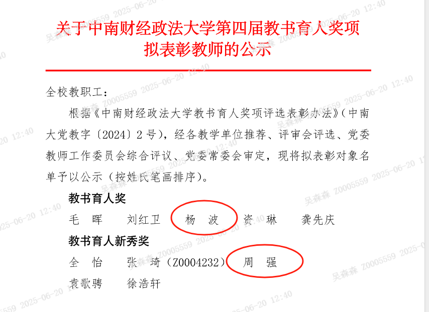在第四届教书育人奖评选中,杨波教授获评“教书育人奖”、周强副教授获评“教书育人新秀奖”。