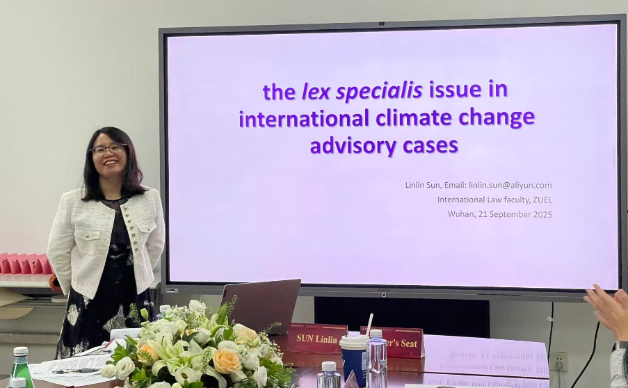 孙林林讲师以“The ‘Lex Specialis’ Issue in Climate Change Advisory Cases”为主题,主要探讨了国际气候变化法律中的特别法(lex specialis)问题,通过分析国际法庭的最新咨询意见,深入研究了国际气候法与其他国际法规则之间的关系。与谈人Faure教授就国际气候法以及其他国际法之间,何时以及如何管理和统一标准(尤其是政府层面的标准)与孙林林讲师展开了讨论。