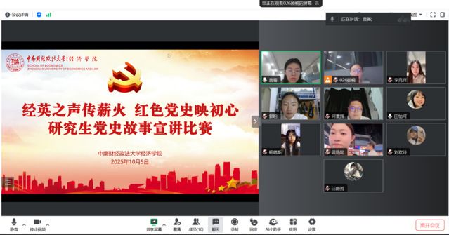 为深入学习贯彻习近平新时代中国特色社会主义思想,全面贯彻落实党的二十大和二十届三中全会精神及全国教育大会精神,引导广大青年学子铭记历史、缅怀先烈、珍爱和平、开创未来,经济学院以“经英之声传薪火,红色党史映初心”为主题举办党史故事宣讲比赛。本次比赛突破传统单一模式,创新采用“线上加线下”双线融合模式,线下于9月29日18时在文泉楼南206室举办,线上于10月5日晚7时以腾讯会议模式开展。本次活动邀请了研究生工作办公室主任岳明泽老师、研究生辅导员雷菁老师、习近平经济思想理论宣讲团团长汪颢哲和研究生会各部门负责人担任评委。