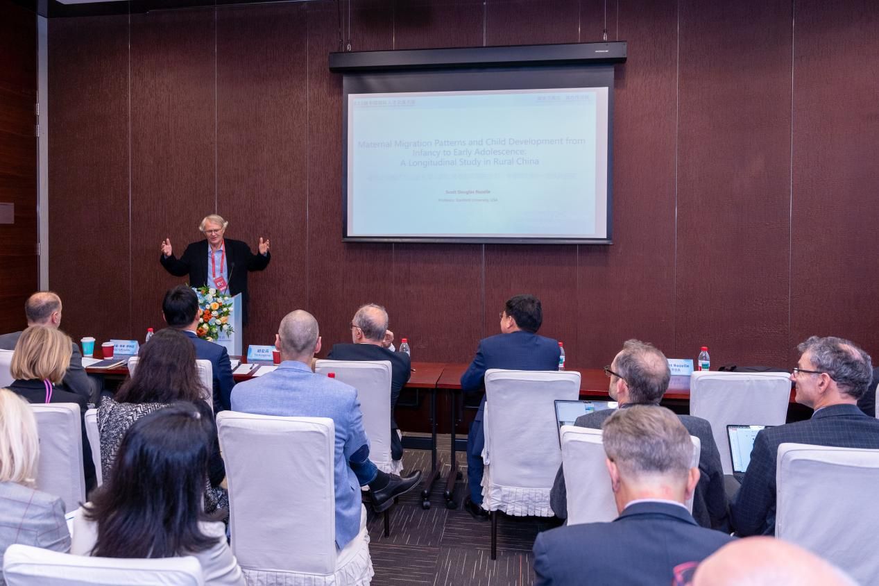 在特邀发言环节,经济学院邀请中国政府友谊奖获得者、新中国成立70周年纪念勋章获得者、斯坦福大学教授Scott Rozelle带来题为”Development from Infancy to Early Adolescence: a Longitudinal Study in Rural China”的主旨演讲,深入解读在中国农村地区母亲的迁移模式对留守儿童早期发展的影响研究,演讲指出中国农村人力资本挑战大,农村儿童认知、语言等发育迟缓率高,即便有教育投入,城乡成绩差距仍大。研究显示25%50%农村母亲外出务工,其持续迁移对留守儿童认知发展、BMI有显著负面影响且具有长期性。